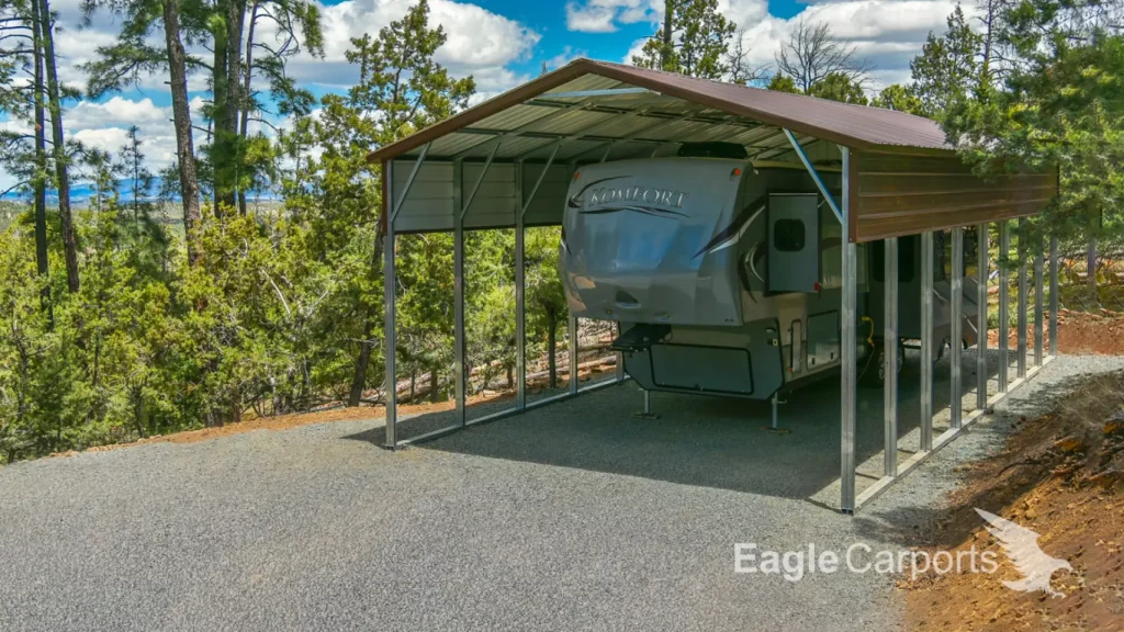 Protect your RV from the elements with our durable 18x40x15 Metal RV Cover. Featuring a vertical roof design for maximum strength and stability.