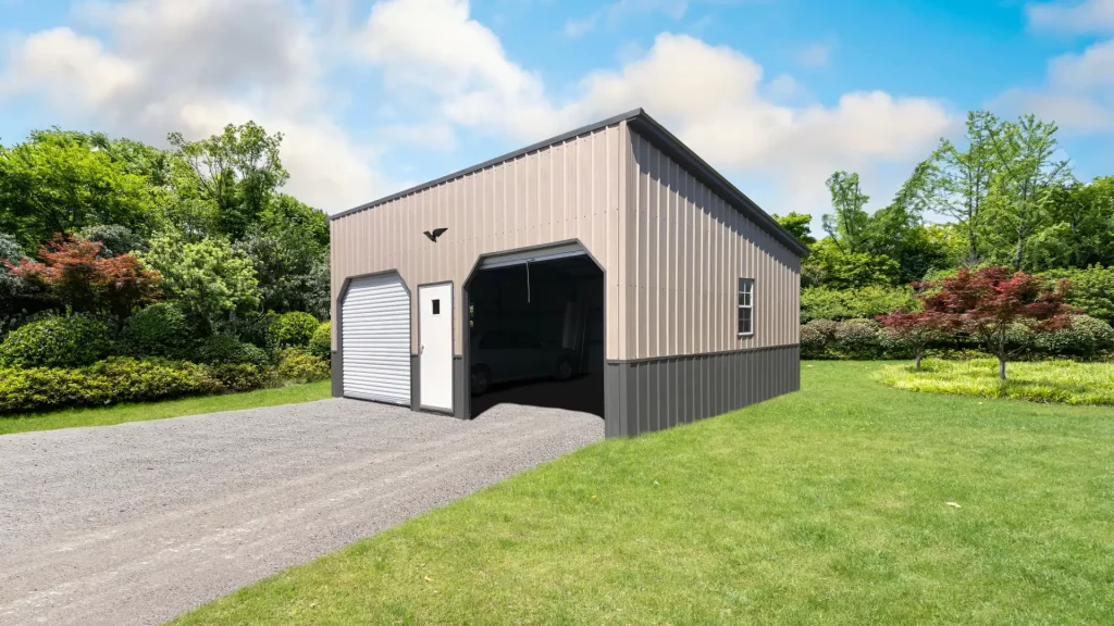 The 20x25x12 Boxed Eave Roof Metal Garage offers ample space for storage or parking, with a durable metal construction and a stylish boxed eave roof design.