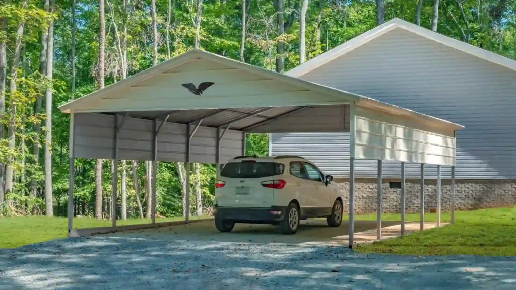 The 20×25×9 Metal Carport Vertical Roof offers shelter for two vehicles, an RV, or a boat. Its vertical roof design sheds rain and debris to keep the area clear. This metal carport provides durable, year-round coverage for parking or storage.