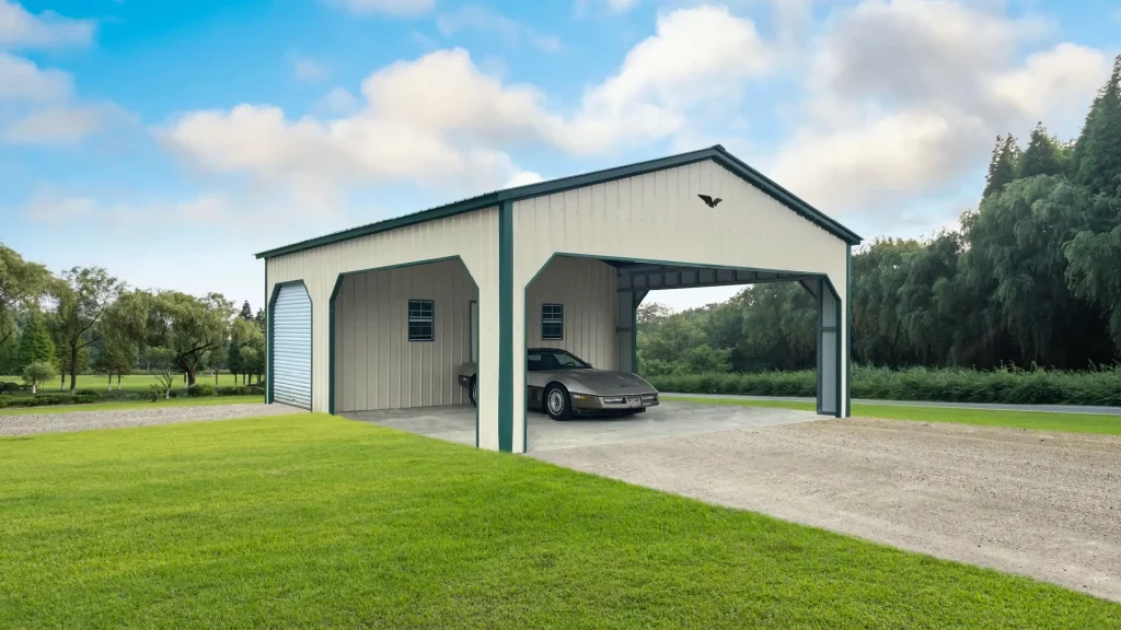 The 24x30x10 Metal Combo Unit with a vertical roof is a versatile and durable storage solution, perfect for housing vehicles, equipment, and more.