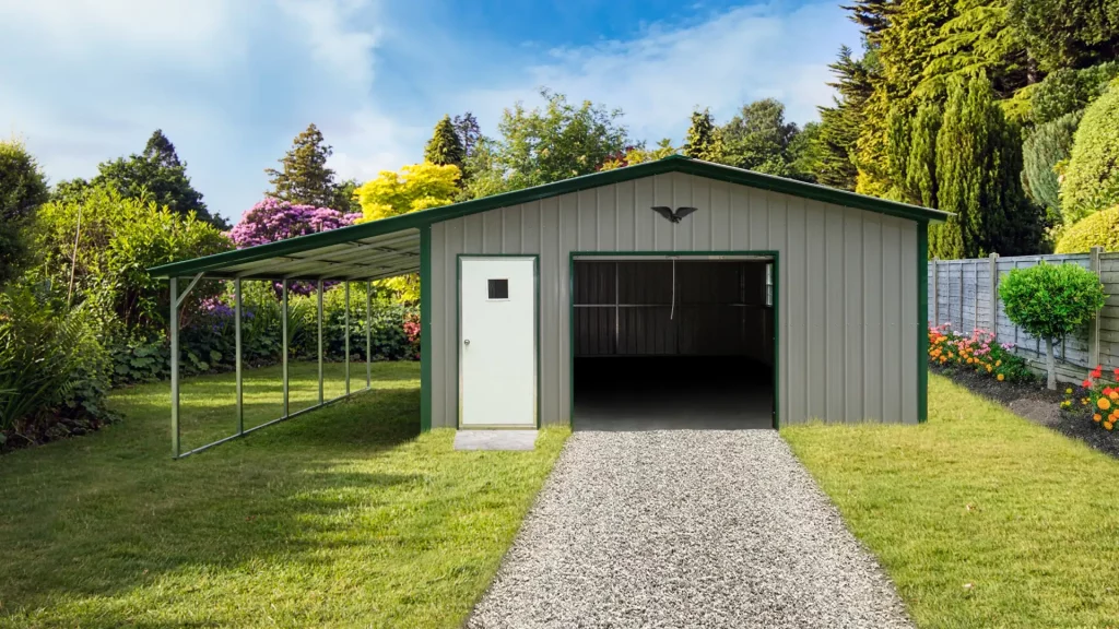 The 28x25x9/6 Metal Garage with 8F Wide Lean-To features a durable vertical roof design, providing ample space for storage and shelter for vehicles or equipment.