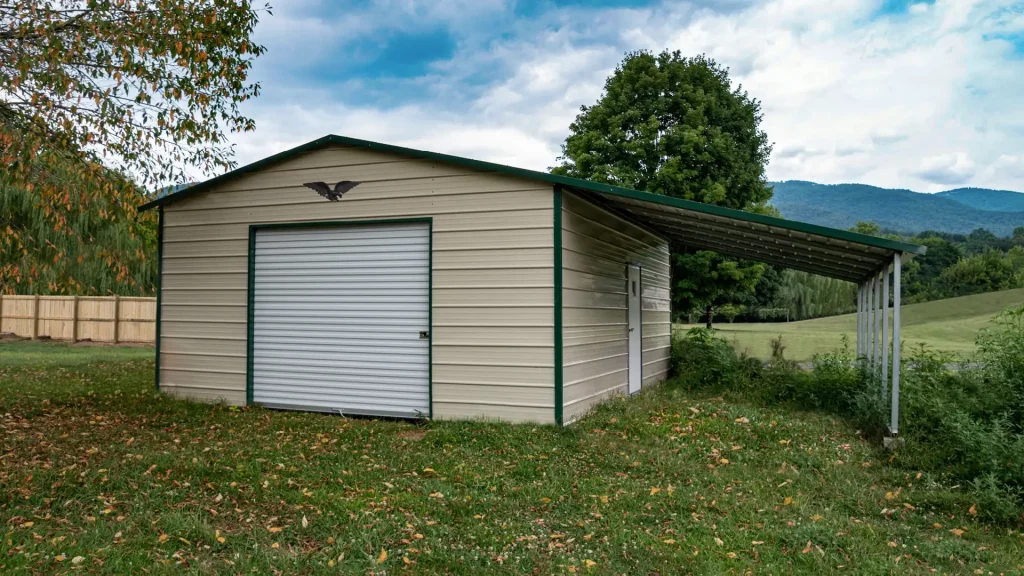 The 32x25x9/6 Metal Garage with 12′ Lean-To features a sturdy boxed eave roof, providing ample space for storage and shelter for vehicles or equipment.