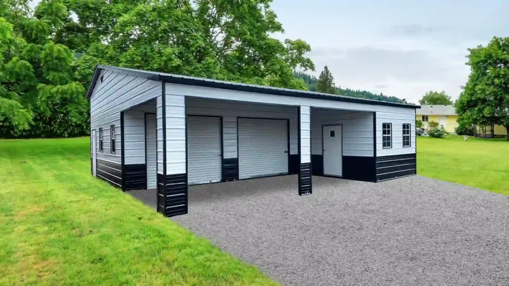 The 32x35x12/9 Metal Garage with 12′ Lean-To features a durable vertical roof design, providing ample space for storage and a convenient lean-to for additional shelter.