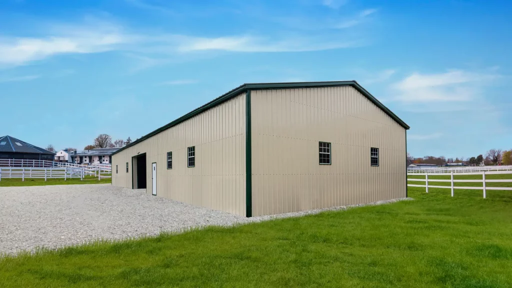 The 32x85x14 Metal Workshop with a vertical roof is the ultimate solution for all your storage and work needs. With its spacious dimensions, this workshop offers ample space to store and organize your tools and equipment. The vertical roof design not only adds a touch of elegance but also ensures maximum durability and protection against harsh weather conditions. Constructed with high-quality metal, this workshop is built to last, providing you with a reliable and secure space for all your valuable belongings. Whether you need a workshop for your DIY projects or a storage space for your professional tools, this metal workshop is the perfect choice. Invest in this versatile and sturdy structure today and enjoy the peace of mind that comes with knowing your tools and equipment are safe and protected.