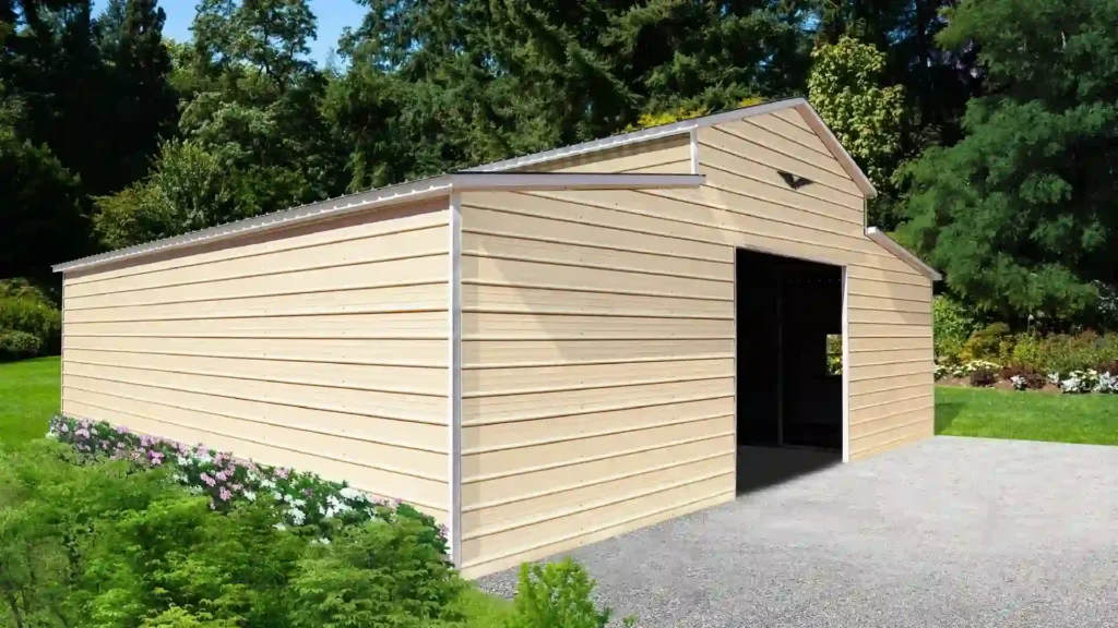 The 34x30x13 Metal Barn with 10′ Lean-To features a durable vertical roof design, providing ample space and protection for your belongings.