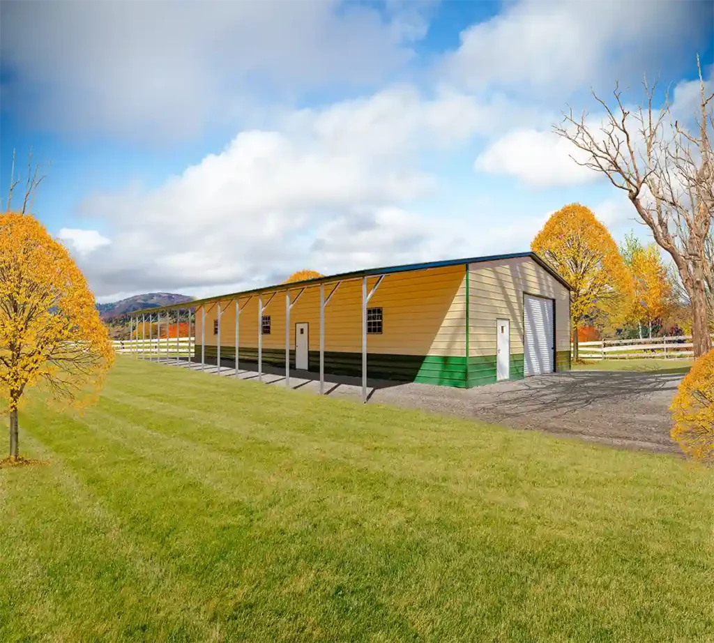The 42x70x12/9 Metal Garage with 12′ Lean-To features a durable vertical roof, providing ample space for storage and a convenient lean-to for additional shelter.