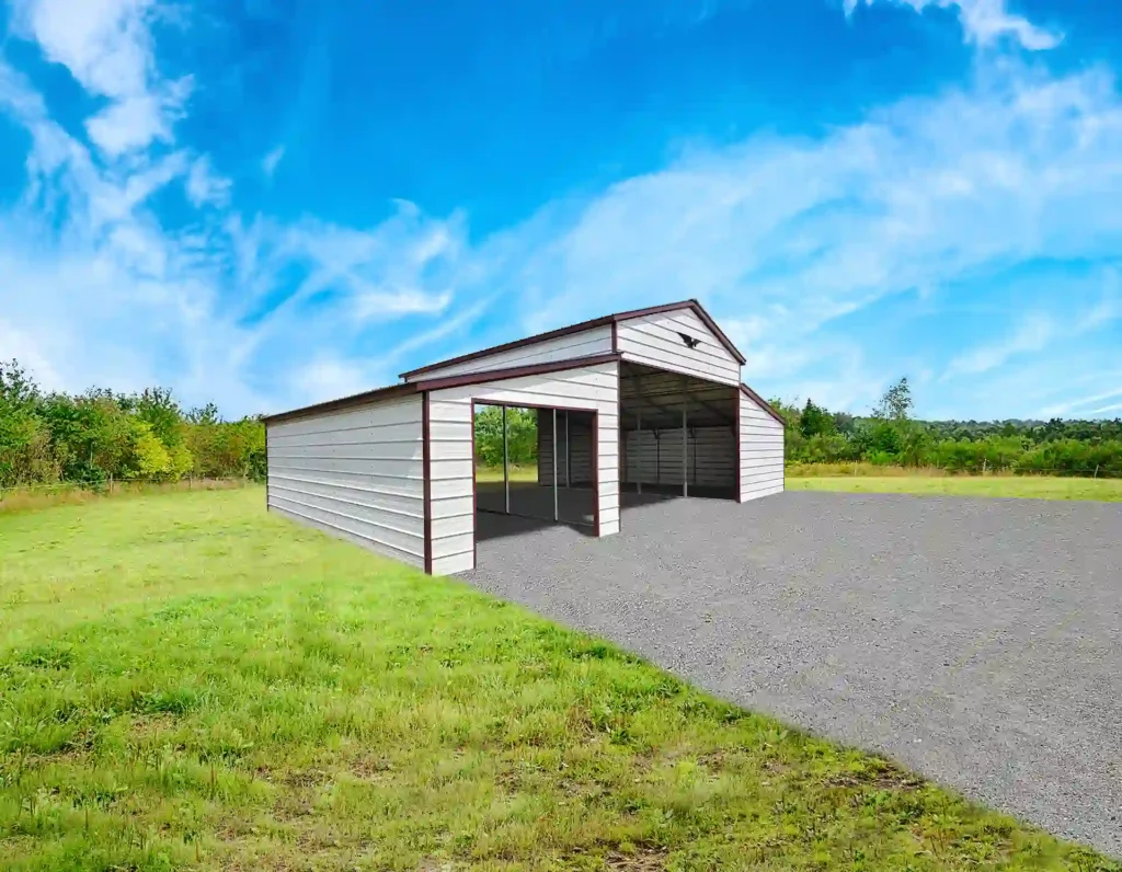The 44x30x12/7 Metal Barn with 12′ Lean-To features a durable vertical roof design, providing ample space and protection for your belongings.