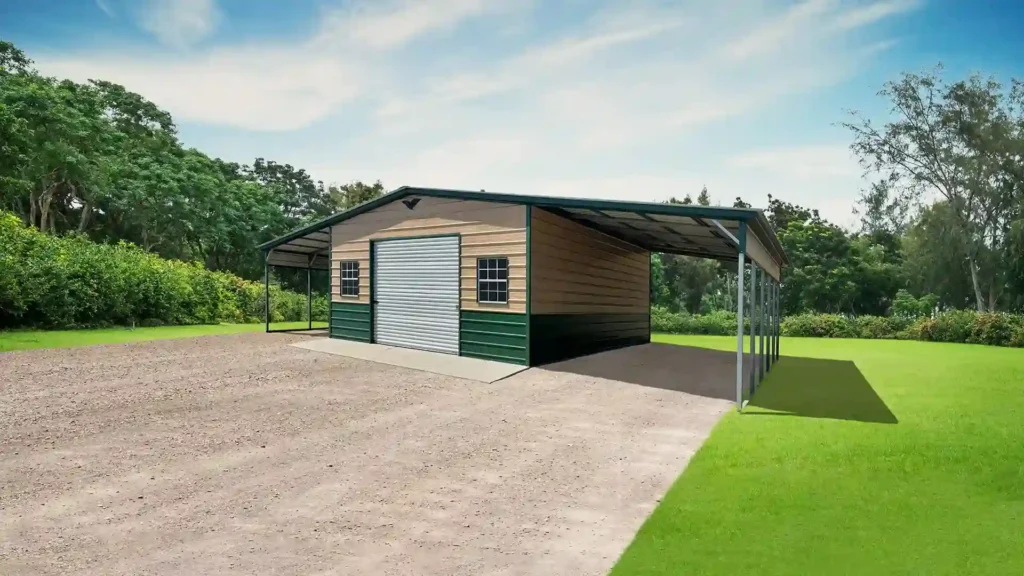 The 46x25x10/7 Metal Garage with 12′ Lean-To features a durable vertical roof design, providing ample space for storage and shelter for vehicles or equipment.