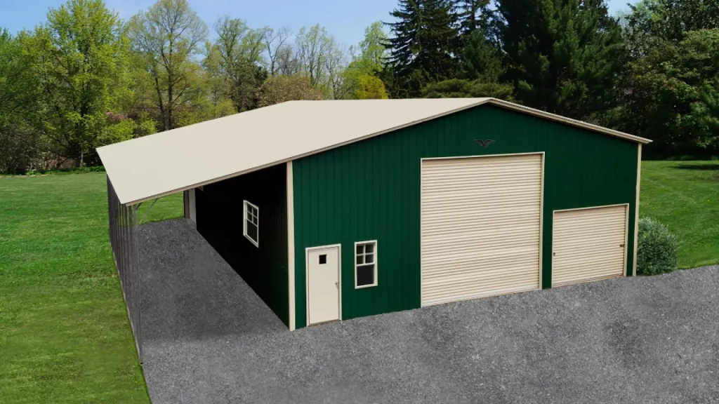 The 48x50x12/12 Metal Garage with Lean-To features a vertical roof design, providing ample space for storage and shelter for vehicles.