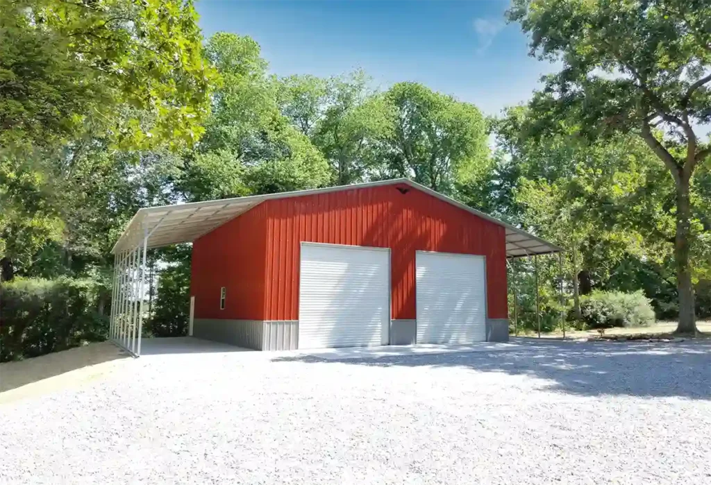 The 62x40x16/13 Metal Garage with 12′ Lean-To features a durable vertical roof design, providing ample space for storage and shelter for vehicles or equipment.